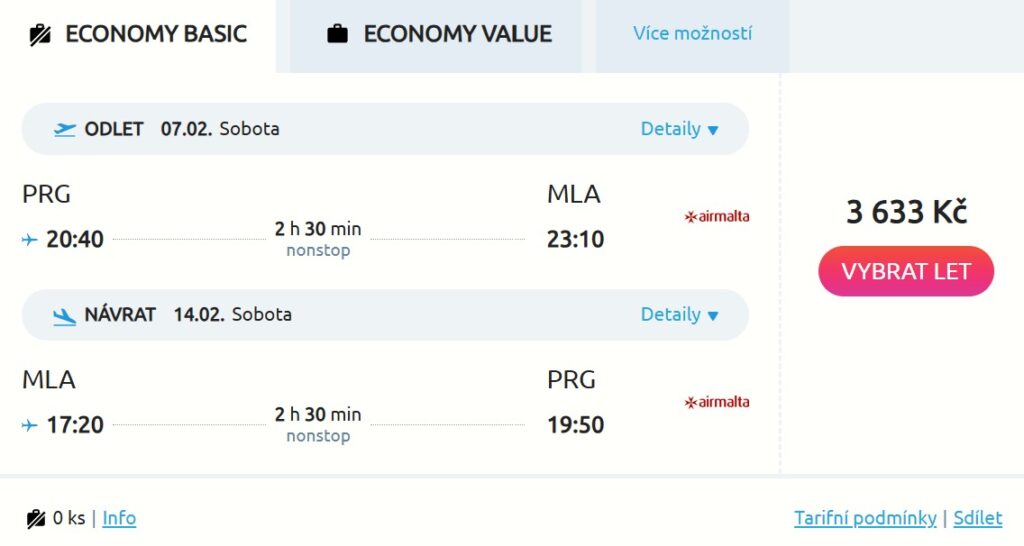 Sympatickou destinací pro zimní únik za příjemnějšími teplotami a šumem Středozemního moře je ostrov Malta. Využij pěkné nabídky letenek od tamějšího vlajkového dopravce KM Malta Airlines a naplánuj si zimní výlet na Maltu. Zpáteční letenky z Prahy (PRG) na letiště Luqa (MLA) tě vyjdou na 3 633 Kč, a to např. v termínu od 7. do 14. února 2026. V nabídce letecké společnosti pro zimní letový řád 2025/2026 visí dva lety týdně vypravované vždy v úterky a soboty. Přehled všech dostupných termínů najdeš v našem kalendáři.