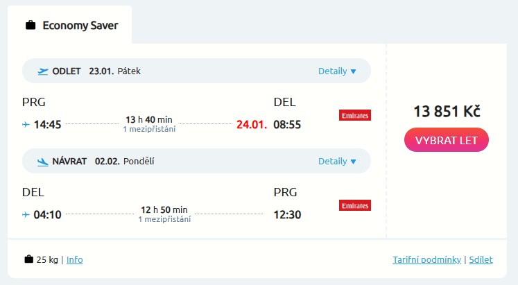 Vychutnej si pohodlný let na palubě největšího dopravního letadla na světě s oblíbenou aerolinkou Emirates. Ta nabízí pěkné zpáteční letenky do Indie z Prahy, a to konkrétně do Dillí a Bombaje. Vyjdou tě na 13 851 Kč v termínech od ledna do června příštího roku a v ceně máš samozřejmě i odbavené zavazadlo do 25 kg. Tak leť do barevné Indie například od 23. ledna do 2. února. Po cestě tě čeká přestup v Dubaji.
