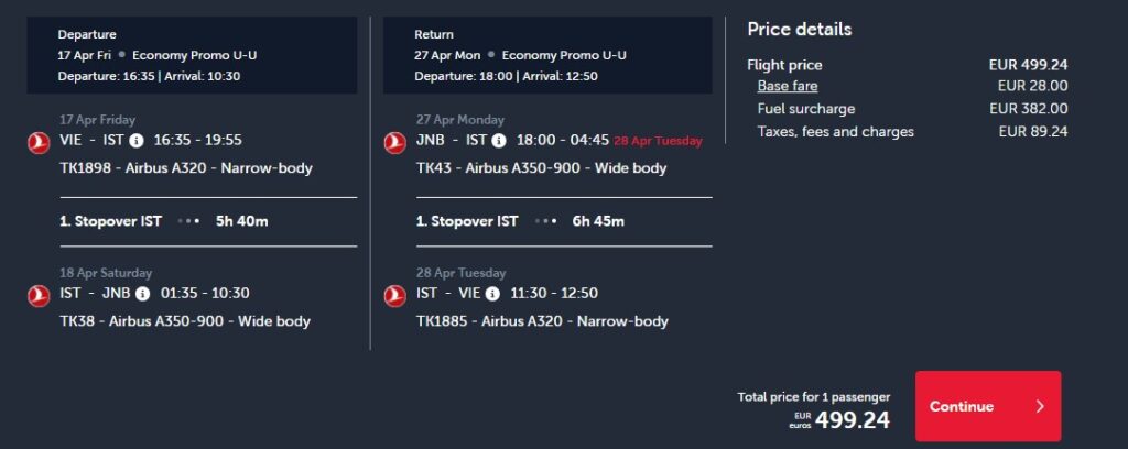 Poznej daleký jih černého kontinentu díky pěkným letenkám, které nabízí skvělá aerolinka Turkish Airlines. Zpáteční letenky do jihoafrického Johannesburgu z Vídně jsou tvoje za 12 114 Kč a v ceně máš zahrnutou přepravu hned dvou odbavených báglů. Na výběr máš ze spousty termínů během dubna, května či září letošního roku. Tak leť do divoké Afriky například od 17. do 27. dubna. Po cestě tě čeká jeden přestup v tureckém Istanbulu.