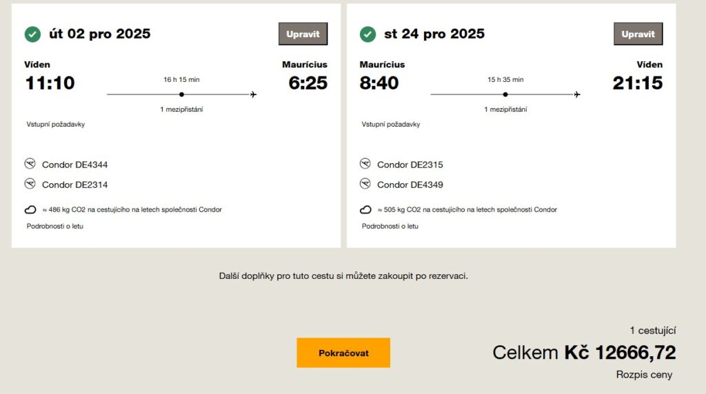 Německá aerolinka Condor přináší také velice pěkné letenky do Indického oceánu. Na dechberoucí Mauricius se vypravíš z Vídně nebo Prahy za cenovku, která začíná na parádních 12 666 Kč v případě odletů z Rakouska. Z Letiště Václava Havla poletíš od sympatických 13 445 Kč. Termíny jsou dostupné během zimních měsíců, konkrétně od začátku prosince do února příštího roku. Tak uleť zimě na Mauricius například od 2. do 24. prosince. Po cestě tě čeká jeden přestup v německém Frankfurtu.
