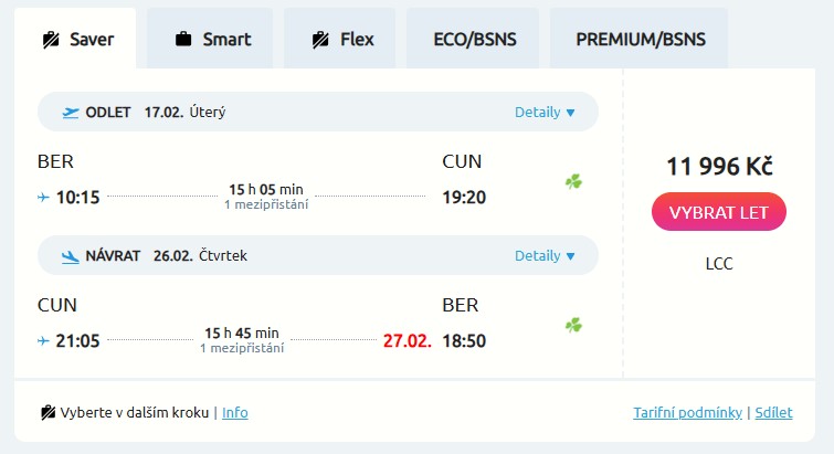 S velice pěknou nabídkou zpátečních letenek na mexický poloostrov Yucatán přichází irská aerolinka Aer Lingus, takže pokud se chceš vypravit do země Mayů, nenech si ji ujít. Cesta z Berlína do Cancúnu tě vyjde na sympatických 11 996 Kč v termínech během hlavní sezóny od ledna do března příštího roku. Tak si užij karibskou pohodu, návštěvu památek a vynikající jídlo od 17. do 26. února. Po cestě tě čeká jeden pohodový přestup v irském Dublinu.