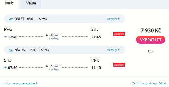 Letenky jsou již nahrány v rezervačním systému aerolinky. Nejlevnější letenky z Prahy do Šardžá, v základním tarifu Basic, aktuálně vyjdou na 7 930 Kč.