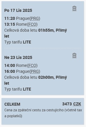 Údaje o nových linkách jsou již nahrány v rezervačním systému dopravce. Například zpáteční letenky z Prahy do Říma vychází v nejlevnějším tarifu Lite s jedním příručákem na 3 473 Kč.