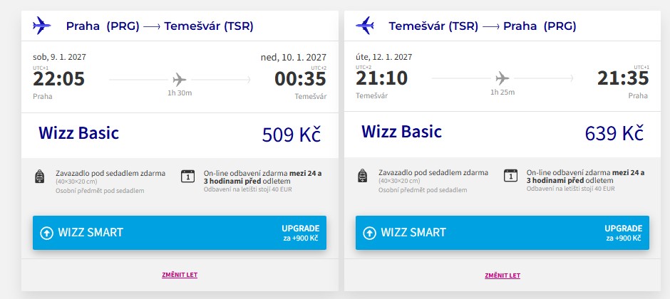Inaugurační let na nové lince z Prahy (PRG) do Temešváru (TSR) od Wizz Airu se uskuteční v sobotu 23. května 2026. V letovém řádu dopravce nalezneš vypsané dvě týdenní rotace – létat se bude ve večerních hodinách v úterky a pátky. Spojení je vypsáno jako celoroční a mezi oběma městy se bude létat, se stejnou frekvencí, také po čas platnosti zimního letového řádu 2026/2027.