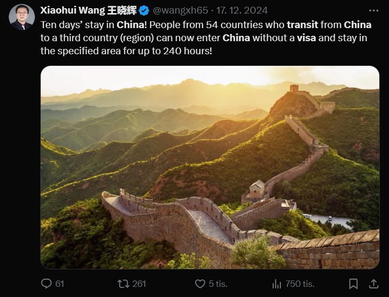 Čínská lidová republika na konci minulého roku uvolnila politiku tranzitních víz a a zároveň sjednotila délku jejich validity. Namísto dříve platných 72 / 144 hodin opravňují nová tranzitní víza cestovatele k pobytu na území ČLR až v délce 240 hodin (10 dnů). Novinka se vztahuje na cestovatele z celkem 54 zemí, vč. České republiky a Slovenska (pro slovenské cestovatele mimochodem platí dokonce bezvízový styk v případě krátkých turistických cest – viz náš magazín Záletník 163). Podmínkou pro jejich uplatnění je dispozice letenkou do třetí země v rámci stanoveného časového horizontu.