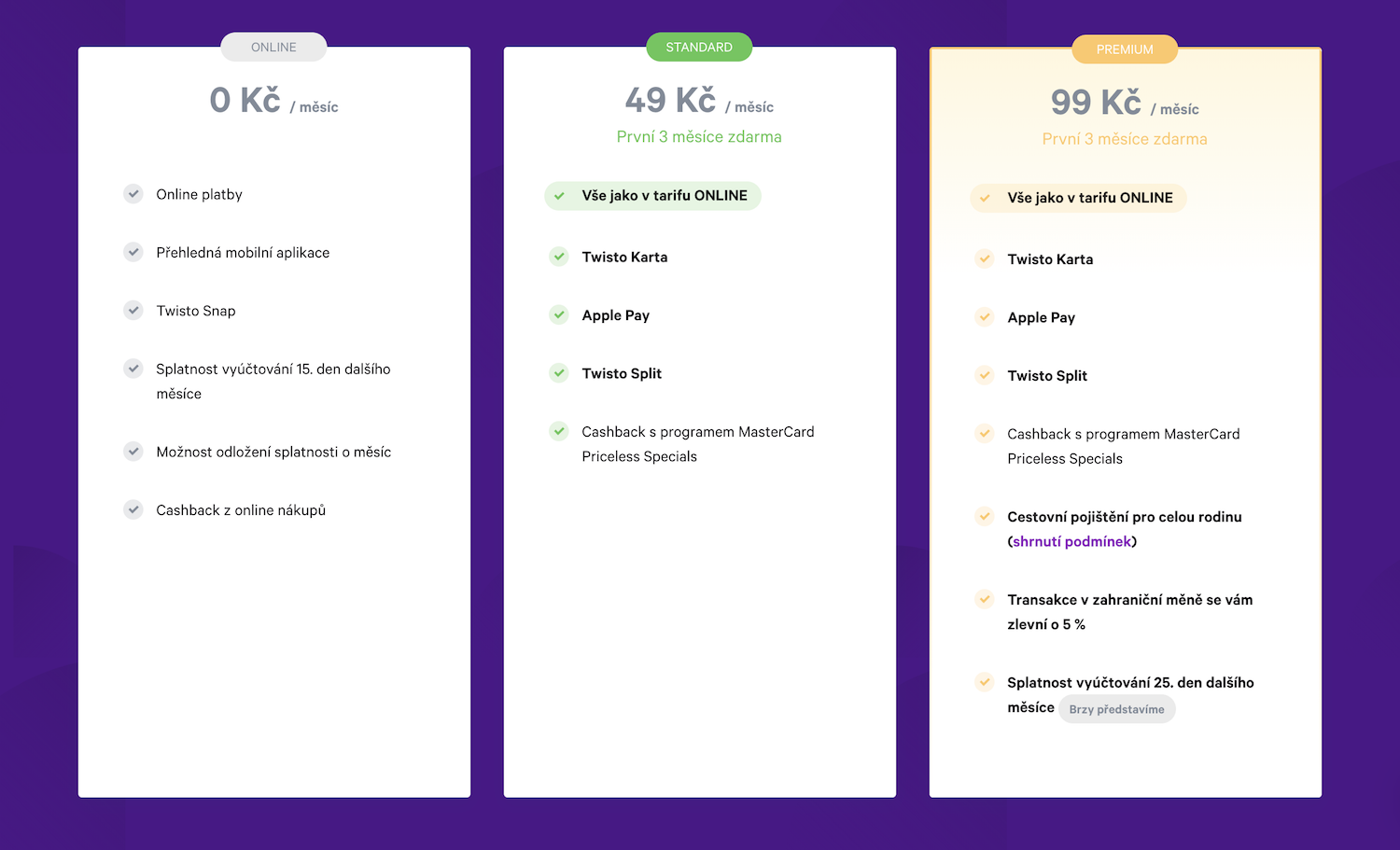 Online tarif je zadarmo, nenabízí ale fyzickou platební kartu, platby skrze Apple Pay ani službu Twisto Split pro rozdělení útraty mezi kamarády. Tarif Standard stojí 49 Kč/měsíc a tarif Premium 99 Kč/měsíc (tyto ceny jsou aktuální k 8. červenci 2019). Twisto Premium nabízí ty nejvýhodnější směnné kurzy pro platby v cizích měnách a také cestovní pojištění pro až 6 osob v jedné domácnosti. Tarif Standard i Premium můžete vyzkoušet na první 3 měsíce zadarmo.