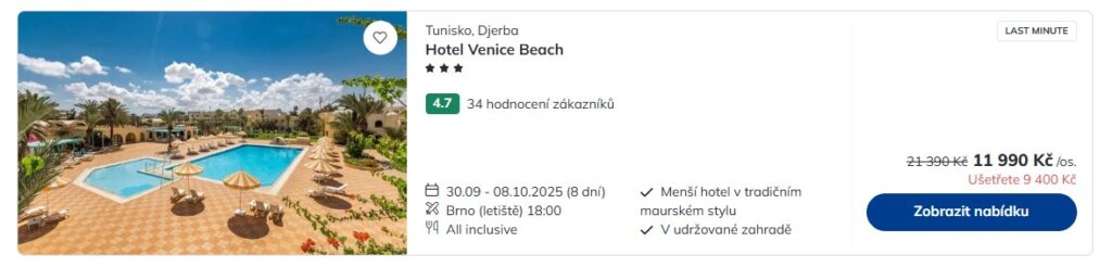 Pokud si chceš užít parádní dovolenou bez davů turistů a prodloužit si léto, je tuniská Djerba na začátku října tou pravdou destinací. Cestovní kancelář Čedok nabízí levné zájezdy z Brna na Djerbu, kdy jejich cena startuje na 11 990 Kč. Bydlet budeš ve tří- nebo čtyřhvězdičkovém hotelu s all inclusive a poletíš přímým letem na palubě Smartwings. V ceně máš také odbavený bágl do 23 kg, transfery na místě a služby česky mluvícího delegáta. Tak si užij pohodu na Djerbě od 30. září do 7. října.
