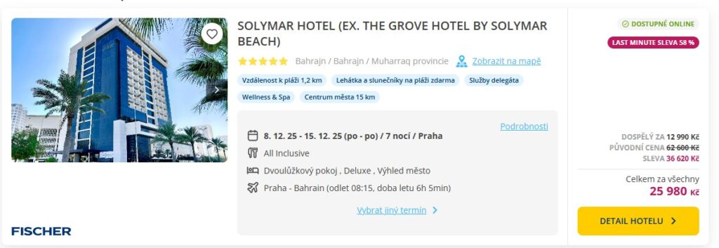 Dej zimě košem a vydej se místo mrznutí po cestě do práce nasávat atmosféru Perského zálivu. V nabídce cestovní kanceláře Fischer nyní ulovíš pěkné zájezdy i do méně tradičních destinací – třeba do Bahrajnu. Celý balíček s odletem z Prahy pořídíš za 12 990 Kč do 5* hotelu Solymar, případně za 15 990 Kč si užiješ odpočinek ve 4* Novotelu přímo u pláže. Týdenní dovolená začíná v pondělí 8. prosince, tak začni balit bágly.