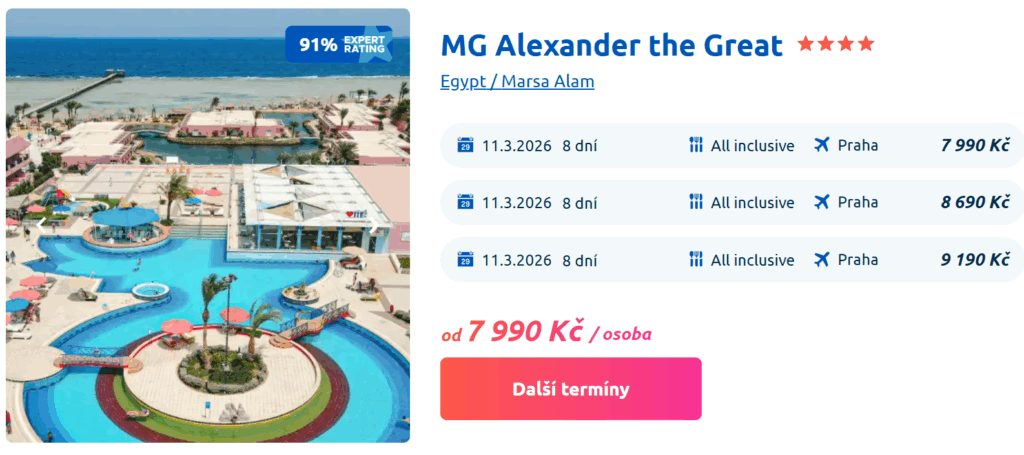 Pár hodin v letadle a můžeš se slunit na písečné pláži v Hurghadě nebo pozorovat korály v Marsa Alam. CK Čedok nasazuje zájezdům do Egypta bezkonkurenčně nízké cenovky, které se nevyplatí přehlédnout. Od neuvěřitelných 7 990 Kč na osobu teď na našem webu pořídíš týdenní last minute zájezdy do Egypta v termínu od 11. do 18. března. Tentokrát můžeš letět z Prahy (PRG) a vybrat si jeden ze 4* nebo 5* hotelů v oblíbené Hurghádě (HRG) nebo jižnější Marsa Alam (RMF). Všechny zájezdy zahrnují formu stravování all inclusive.