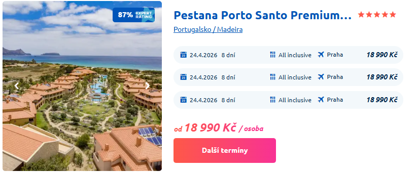 Portugalský ostrov Porto Santo je novinkou mezi destinacemi teprve od minulého roku. Tento klidný kousek Atlantiku láká na dlouhé písečné pláže, minimum davů a pohodovou atmosféru ideální pro jarní únik za sluncem. Tentokrát si přes náš web můžeš rezervovat týdenní pobyt v termínu od 24. 4. – 1.5. 2026 v luxusním 5* resortu Pestana Porto Santo All Inclusive Premium Beach & SPA s formou stravování all inclusive za 18 990 Kč na osobu. Za danou cenu si můžeš vybrat mezi 3 typy pokojů: Dvoulůžkový pokoj, Suite economy pro 2 osoby (pokoj + obývací prostor) a Rodinný pokoj pro 2 osoby.