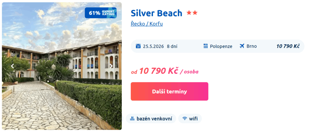Hledáš první opravdové léto ještě před hlavní sezónou za pár korun? Řecký ostrov Korfu patří mezi nejkrásnější destinace Středozemního moře a právě teď můžeš rezervovat na našem webu týdenní dovolenou už od 10 790 Kč za osobu. V termínu 25. 5. – 1. 6. 2026 jsou k dispozici pobyty v 3* a 4* hotelech s polopenzí nebo all inclusive programem. Odlétat budeš z letiště Brno – Tuřany (BRQ) s příletem na Korfu – Ioannis Kapodistrias Airport (CFU), přičemž o komfortní cestu se postará letecká společnost Smartwings.