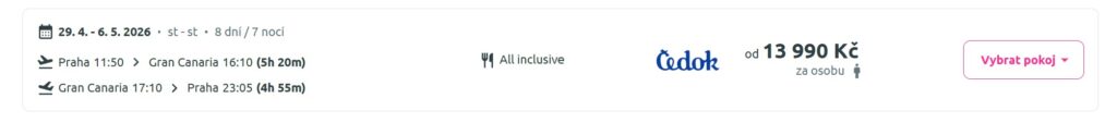 Odleť ve středu na Kanárské ostrovy. V last minute nabídce cestovní kanceláře Čedok ulovíš zájezd z Prahy na ostrov Gran Canaria za skvělou cenu 13 990 Kč. Na místě tě čeká týdenní pobyt ve velmi dobře hodnoceném 3* hotelu Mirador Maspalomas ležícím ve stejnojmenném letovisku na jižním pobřeží ostrova, a také stravování formou all inclusive!