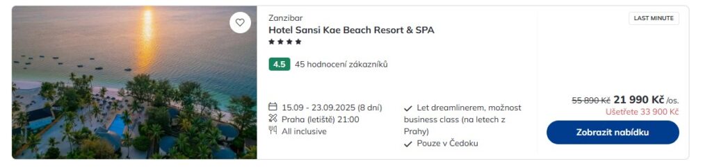 Opět ti přinášíme parádní last minute zájezdy z Prahy na Zanzibar s odletem už v pondělí večer. V nabídce od cestovní kanceláře Čedok na tebe čekají celé balíčky s all inclusive ve 4* hotelu od suprové ceny 21 990 Kč. Ta zahrnuje, kromě ubytování a stravy, také let operovaný aerolinkou Neos Air, odbavený bágl do 20 kg, transfery na místě a služby česky mluvícího delegáta. Tak si přes víkend sbal bágly a užij si týden plný tropů a pohody v ráji.