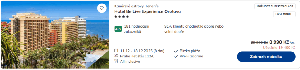 Týden na Tenerife si teď můžeš dopřát už od 8 990 Kč včetně all inclusive. Odlet je naplánován na čtvrtek 11. 12. z letiště Praha (PRG) a návrat na 18.12. z letiště Reina Sofía (TFS). O komfortní přepravu se postará společnost Smartwings se svým letounem Boeing 737 MAX 8.