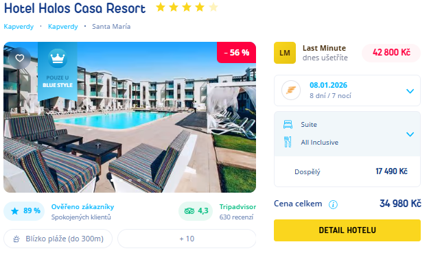 Vyraz v lednu za teplem díky atraktivní nabídce cestovní kanceláře Blue Style. Kapverdské ostrovy, konkrétně oblíbený ostrov Sal, lákají na dlouhé písečné pláže, slunce a příjemnou atmosféru. Last minute zájezdy s odletem z Prahy jsou k dispozici už od 17 490 Kč. Odlet připadá na čtvrtek 8.1. a návrat zpět je plánován na 15.1.