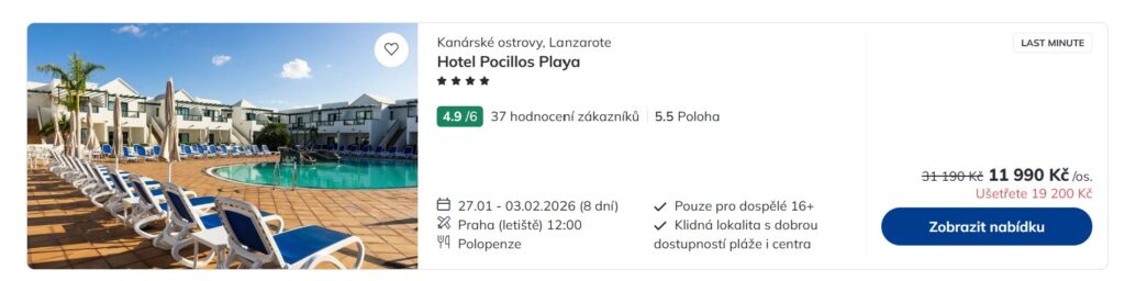 Další týden a další tip na zájezdy s cílem na Kanárských ostrovech. Uteč naší středoevropské zimě a vydej se vstříc příjemnějším teplotám i slunečním paprskům na ostrov Lanzarote. V nabídce cestovní kanceláře Čedok ulovíš last minute zájezd z Prahy na Lanzarote za 11 990 Kč. Na místě tě čeká sedm nocí v dobře hodnoceném čtyřhvězdičkovém hotelu Pocillos Playa ležícím nedaleko letiště a zároveň i hlavního města ostrova, Arrecife. Kromě pěkného zázemí s v hotelu můžeš těšit také na stravování formou polopenze, které je zahrnuje v ceně zájezdu.