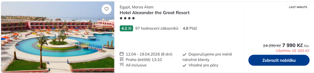 Pro termín 12. – 19. dubna si můžeš u nás na webu rezervovat pobyty v ověřených 4* a 5* resortech. Ceny začínají už na 7 990 Kč za osobu a zahrnují all inclusive stravování, zpáteční letenky z Prahy (PRG) do Marsa Alam (RMF), transfery, služby delegáta i příruční a odbavené zavazadlo. Let zajišťuje Smartwings, takže tě čeká pohodlná cesta bez přestupů a minimum starostí.