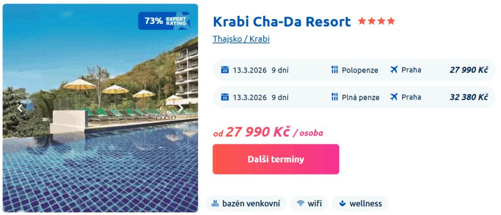 Pokud hledáš místo, kde si můžeš dovolenou užít opravdu v klidu, právě teď můžeš vyrazit na týden do thajské provincie Krabi. Na našem webu aktuálně najdeš týdenní zájezdy s odletem z Prahy v pátek 13. března a návratem 21. března už od 27 990 Kč 20 990 Kč za osobu. V ceně je 7 nocí ve 4* a 5* hotelech s polopenzí nebo snídaní.