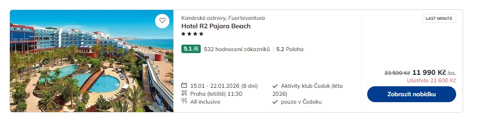 Využij pěkné nabídky cestovní kanceláře Čedok, u níž ulovíš last minute zájezdy z Prahy na Fuerteventuru s all inclusive za skvělé ceny od 11 990 Kč! Odlet z české metropole je naplánován již na zítřejší poledne, takže s rozmýšlením příliš dlouho neotálej! Na Kanárských ostrovech tě čeká týdenní pobyt, během něhož nalezneš zázemí v jednom z dobře hodnocených čtyřhvězdičkových hotelů ležících na samém jihu ostrova Fuerteventura – konkrétně nedaleko letoviska Morro Jable a krásné pláže Playa del Matorral.