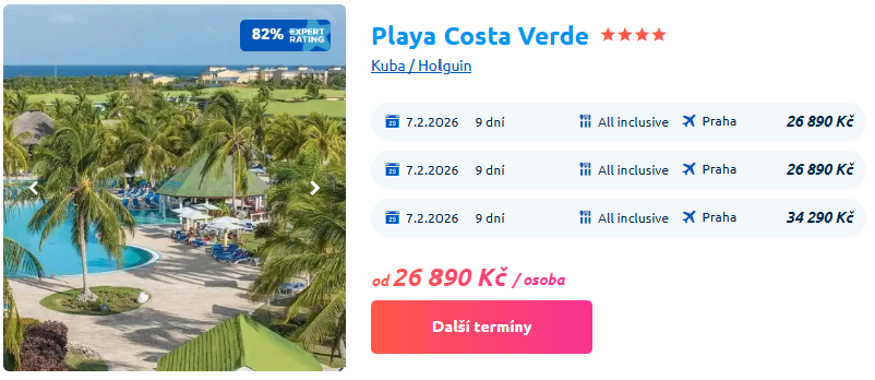 Pokud tě láká útěk za sluncem a teplem, Kuba je skvělou volbou. Právě teď přes náš vyhledávač pořídíš zájezdy z Prahy na Kubu od 26 890 Kč za osobu. Termín připadá na 7. až 15. února, kdy můžeš strávit sedm nocí v komfortních čtyřhvězdičkových a pětihvězdičkových resortech s all inclusive servisem.