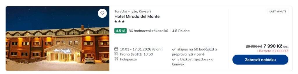 Oujé! To už zavání skoro krádeží za bílého dne! Odleť v sobotu prášit na turecké svahy! Zimní zájezdy z Prahy do Turecka ulovíš v last minute nabídce cestovní kanceláře Čedok za neskutečně lákavé ceny od 7 990 Kč! Ve středním Turecku, konkrétně v letovisku Erciyes, tě čeká sedm nocí ve vybraném hotelovém zařízení, dokonce s polopenzí v ceně. V nabídce zbývají poslední volná místa, tak se nerozmýšlej dlouho.