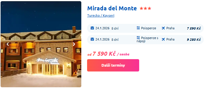 Další turnus týdenních lyžařských zájezdů vypraví CK Čedok už tuto sobotu 24. ledna. Atraktivní nabídka zimních pobytů v Turecku je právě teď za akční cenu 7 490 Kč na osobu a zahrnuje samozřejmě přepravu lyžařského vybavení a navíc skipas na 50 bodů. Moderní lyžařské středisko Erciyes je ideální lokalita kam vyrazit za sněhem, sluncem a perfektně upravenými sjezdovkami.