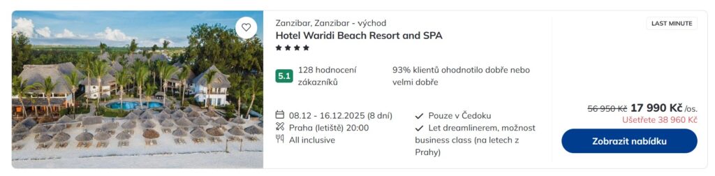 Dej vale začínajícímu předvánočnímu shonu a vyraz si užít druhý adventní týden na krásné sněhobílé pláže Indického oceánu. V nabídce cestovní kanceláře Čedok ulovíš last minute zájezdy z Prahy na Zanzibar za velmi atraktivní ceny od 17 990 Kč! Na místě tě čeká týdenní pobyt v jednom z vybraných čtyřhvězdičkových hotelů se stravováním formou all inclusive. S rozmýšlením dlouho neváhej – v letadle zbývají poslední volná místa a odlet je naplánován již na pondělní večerní hodiny.