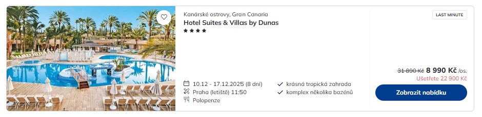 S dalšími last minute zájezdy na Kanárské ostrovy za extrémně parádní ceny přichází cestovní kancelář Čedok. Zájezdy z Prahy na ostrov Gran Canaria startují na 8 990 Kč! Za tuto cenu tě čeká týdenní pobyt v dobře hodnoceném čtyřhvězdičkovém hotelu Suites & Villas by Dunas v letovisku Maspalomas ležícím na samotném jihu ostrova a navíc stravování formou polopenze. Za příplatek pouhé tisícovky, resp. patnácti stovek, si ale můžeš dopřát zázemí dalších hotelů ve stejné oblasti, které nabízejí dokonce all inclusive servis!