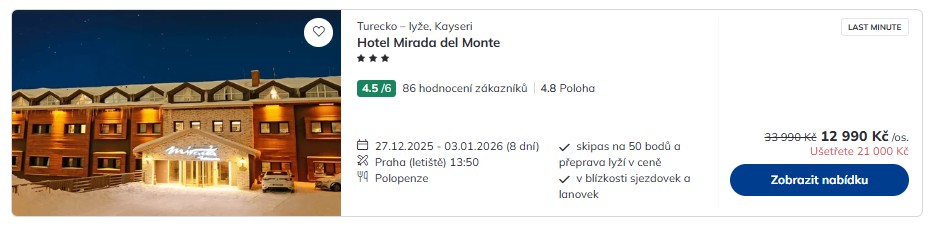 Také během zimní sezony 2025/2026 nabídne cestovní kancelář Čedok lyžařské zájezdy do Turecka! Vyprav se do turecké Kappadokie hned v rámci prvního turnusu přes Silvestra a Nový rok – zájezdy z Prahy do Turecka pořídíš za skvělé ceny od 12 990 Kč! Na výběr máš ubytování v několika hotelových zařízení různých kategorií – vesměs se stravováním formou polopenze či polopenze plus (tj. alkoholických nápojů k večeři).