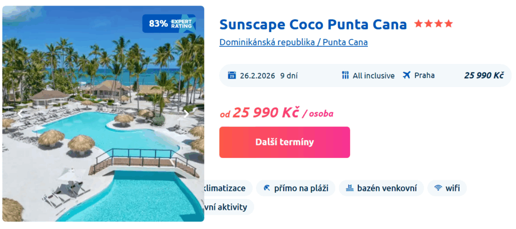 Zimu můžeš vypnout jedním kliknutím na tlačítko rezervovat! Již zítra po obědě můžeš odletět přímým letem z Prahy do Dominikánské republiky. Na našem webu právě najdeš exotické zájezdy do Punta Cany v termínu 26. 2. – 6. 3. za 25 990 Kč za osobu. Čeká tě 8 dní karibské pohody ve 4* a 5* hotelech s all inclusive. Denní teploty se nyní pohybují kolem 28–30 °C, večery zůstávají příjemně teplé a moře má přibližně 27 °C.