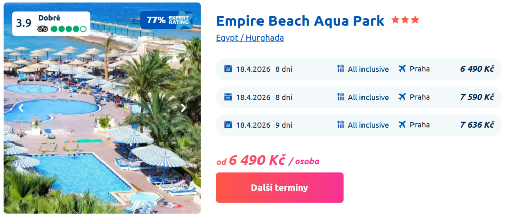 Máš už po krk aprílového počasí a nejradši bys hned teď vyměnil mikinu za plavky a sandály? Tak na nic nečekej, protože jsme pro tebe vyhrabali nabídku zájezdů do egyptské Hurghady, která se prostě neodmítá. Hlavním argumentem je cenovka, která startuje na 6 490 Kč za osobu. Za tuhle částku získáš kompletní osmidenní zájezd v termínu od 18. do 25. dubna. Vybrat můžeš jeden ze 3*, 4* nebo 5* hotelů s all inclusive servisem.
