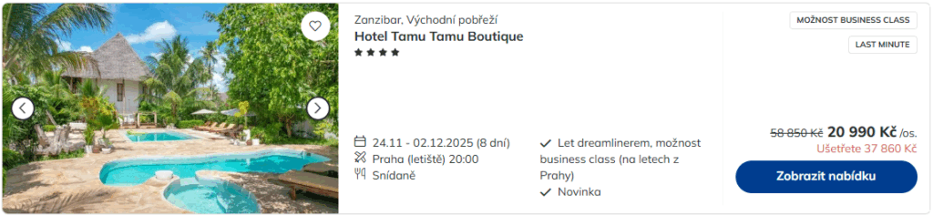 Zanzibar patří mezi top zimní destinace a cestovní kancelář Čedok na to reaguje čerstvou várkou zvýhodněných zájezdů! Pokud přemýšlíš o útěku za sluncem, palmami a tyrkysovým oceánem, teď je ideální chvíle. Nejvýhodnější termín startuje v pondělí 24. 11. na týden. Dovolenou za 20 990 Kč včetně snídaně strávíš ve skvěle hodnoceném 4* hotelu Tamu Tamu Boutique na východním pobřeží ostrova, ve kterém nalezneš skvělé podmínky pro klid a relax. Za příplatek pouhých 2 500 Kč si můžeš užít pobyt v režimu all inclusive.