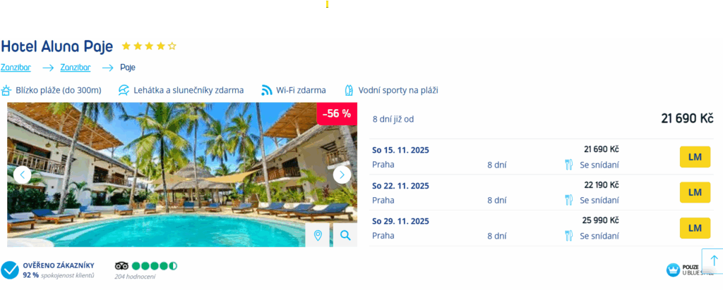 Zapomeň na šedivé počasí doma a vyměň ho za tropický ráj! Cestovní kancelář Blue Style přináší last minute zájezdy z Prahy (PRG) na Zanzibar (ZNZ) od 21 690 Kč. Do destinace tě dopraví aerolinka Smartwings v termínu od 15. do 22. listopadu.