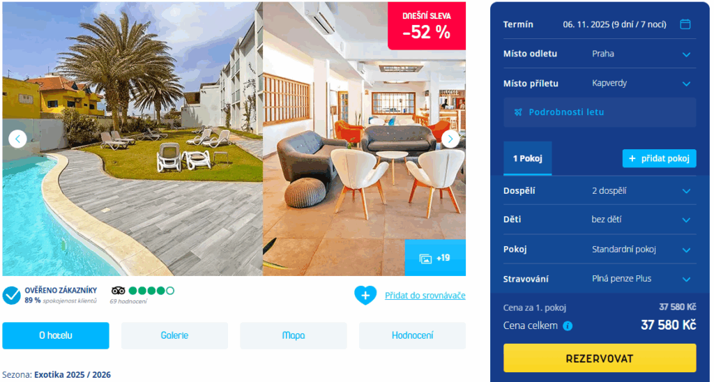 V ceně 18 790 Kč za osobu je týdenní ubytování v dobře hodnoceném hotelu Sobrado, stravování formou plné penze Plus (všechny chody formou bufetů s možností konzumace lehkého alkoholu i u plážového baru) , transfery, odbavené zavazadlo i služby delegáta. Za tuto cenu jsou k dispozici dva termíny odletu od 6. – 14.11. anebo využij státní listopadový svátek a vyraž od 13. – 21.11. 2025.