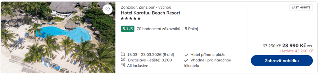 Chceš ještě na poslední chvíli stihnout nějakou exotiku? Vydej se na tropický Zanzibar s CK Čedok, která nyní nabízí last minute zájezdy s odletem z Bratislavy od 23 990 Kč 17 990 Kč za osobu. Na výběr máš z několika čtyř- a pětihvězdičkových hotelů s formou stravování all inclusive nebo polopenze. K dispozici jsou dva termíny pobytu, od 15. 3. – 23. 3. a od 29. 3. – 1. 4. Pokud tě nabídka láká, s rezervací příliš neotálej – většina hotelů má volné poslední pokoje.