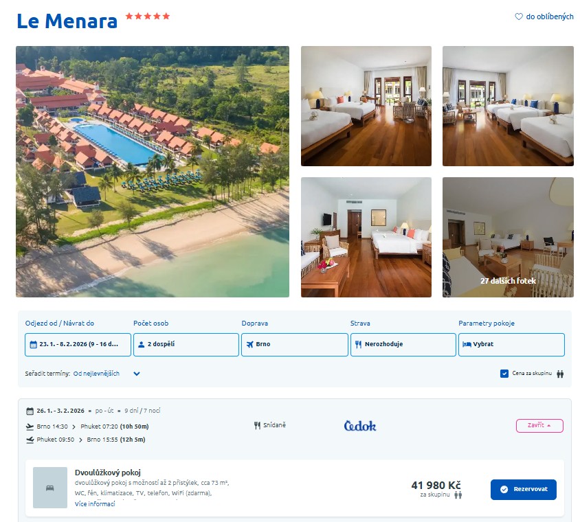 Zakonči první měsíc letošního roku na pláži v Thajsku, třeba s drinkem a knížkou v ruce. V nabídce cestovní kanceláře Čedok teď ulovíš last minute zájezdy z Brna do Thajska od 20 990 Kč. Za nejnižší ceny pořídíš zájezdy v našem vyhledávači. Na výběr máš přitom hned z trojice kvalitních pětihvězdičkových hotelů se snídaní v ceně. Za příplatek lze typ stravování upgradovat na polopenzi. Odlet z Brna připadá na pondělní odpolední hodiny, návrat tamtéž v úterý o týden později.