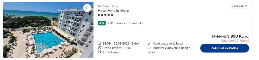 Vychutnej si týden plný luxusu a pohody v 5* hotelu s all inclusive u moře. V nabídce cestovní kanceláře Čedok ulovíš last minute zájezd z Prahy do Albánie, který máš za parádní cenovku 9 990 Kč. Kromě ubytování a stravy máš v ceně také přímý let se Smartwings do Tirany, odbavené zavazadlo do 23 kg, transfery na místě a služby česky mluvícího delegáta. Tak začni balit bágly, neboť odlet je už ve čtvrtek večer.