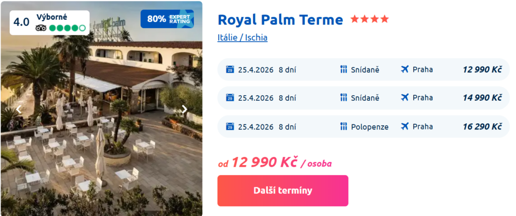 Na italské Ischii na tebe čeká jaro plné slunce, termálních pramenů a pohody u moře. Vyrazit na tento italský ostrov můžeš už 24. dubna s odletem z Prahy s návratem 2. května. Čeká tě sedm nocí v kulisách, které mají blíž k italskému filmu než k běžné dovolené. A cenovka? Začíná na 12 990 Kč za 3* nebo 4* hotel se snídaní, polopenzí nebo all inclsuive stravou. Chytit ji můžeš právě teď na našem webu.