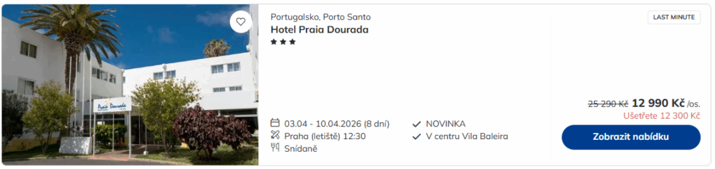 Portugalský Porto Santo – nenápadný ostrov uprostřed Atlantiku, který si zamilují všichni dobrodruzi, kteří se nechtějí jen válet na pláži celý týden. Na termíny od 3. – 10. 4. a 17. – 24. dubna jsme připravili nabídku pobytů v hotelech se snídaní. Ceny začínají už na 12 990 Kč za osobu a svou dovolenou si snadno zarezervuješ přes náš vyhledávač.