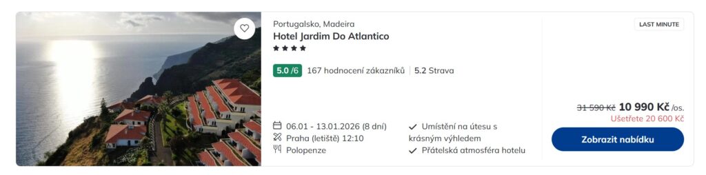 Madeira je skvělou volbou pro aktivní dovolenou prakticky kdykoliv během roku. Využij aktuální nabídky cestovní kanceláře Čedok a vyraz tam hned v druhém lednovém týdnu. Ceny zájezdů z Prahy na Madeiru začínají na těžko překonatelných cenách od 10 990 Kč. Na portugalském ostrově tě čeká sedm nocí v jednom z dobře hodnocených čtyř- a pětihvězdičkových hotelů se snídaní, polopenzí či dokonce all inclusive. Odletět za relaxem i objevováním krás tohoto oblíbeného ostrova ležícího ve vodách Atlantského oceánu můžeš buď v úterý 6. ledna, nebo poté v pátek 9. ledna. Nabídka dostupných hotelů je obou termínech velmi podobná a stejně lákavá!